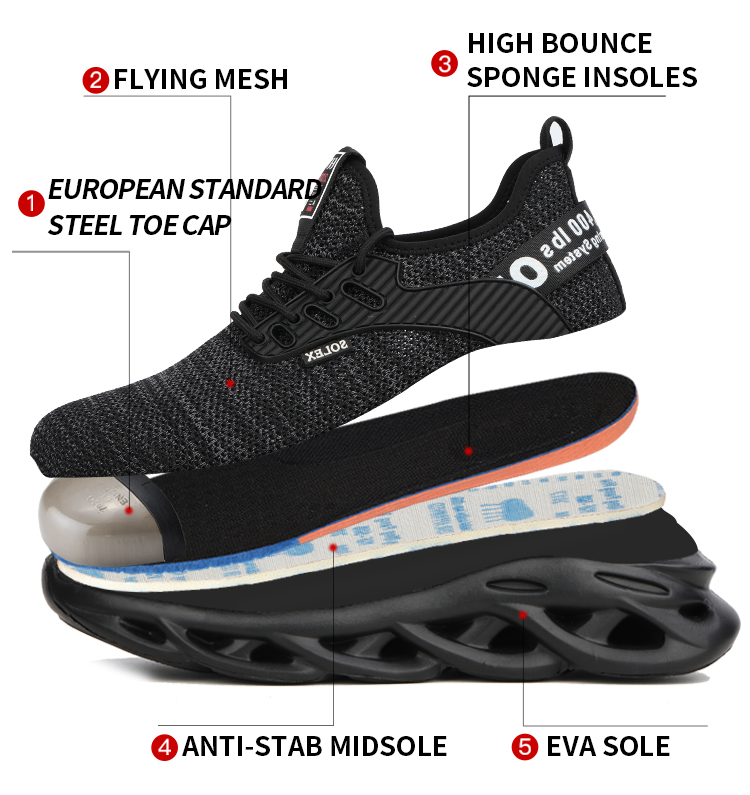 The main functions of shoes are anti smashing, anti piercing and anti-skid.The interior of the shoes contains the European standard steel toe, which can withstand a resistance of 15000N